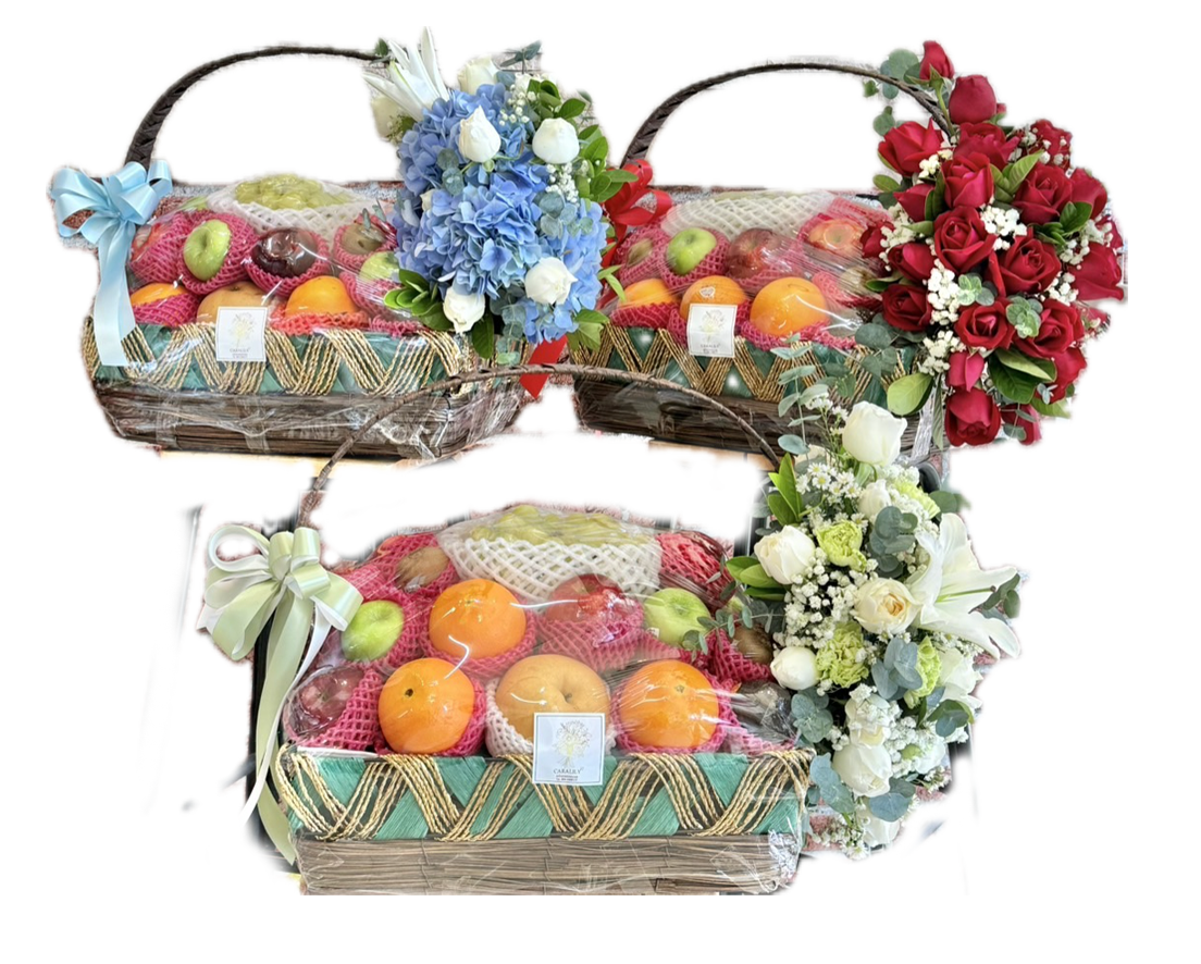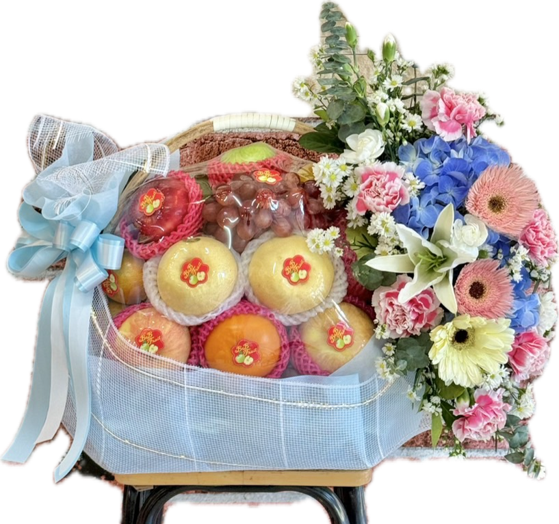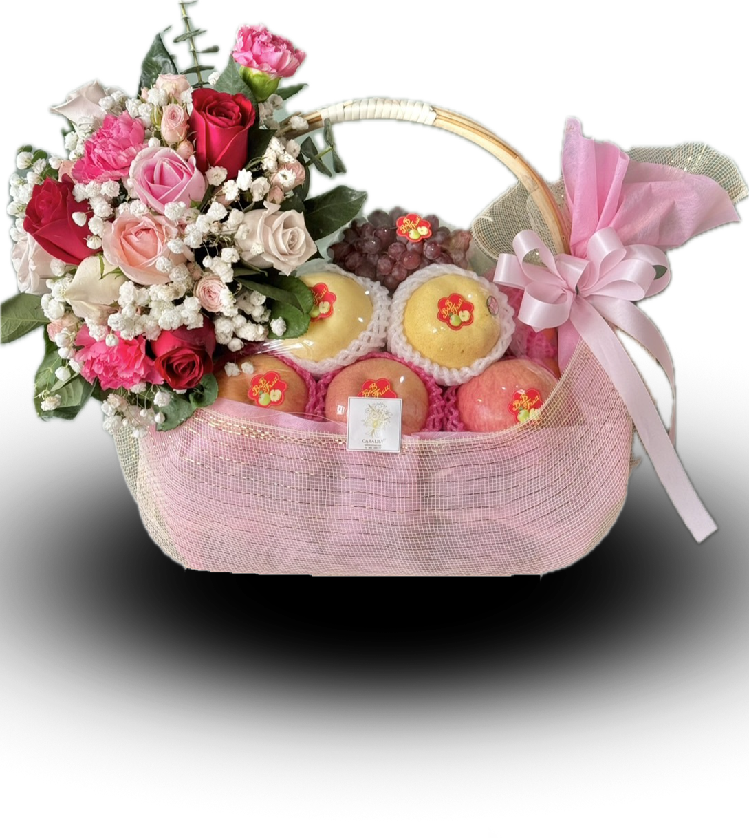 กระเช้าผลไม้สด ประดับดอกไม้ขนาดกลาง